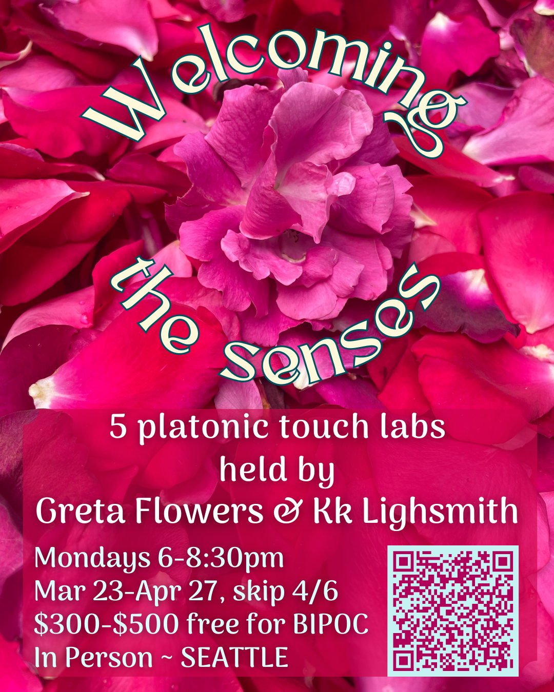 In this five week series, we will hold practice space for giving and receiving platonic touch, getting to know your embodied yes and no, and negotiating touch with others. Drawn from the lineages of Wheel of Consent, Somatic Sex Education, and partner dancing, this series is a feast for the senses. Open to all bodies free for BIPOC
